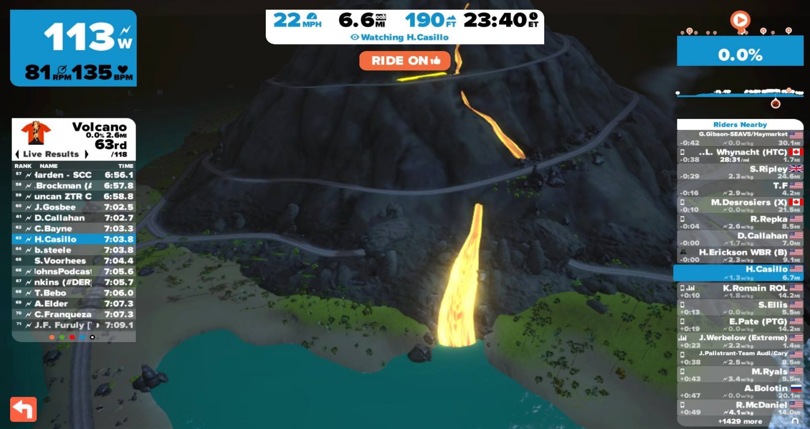 - Volcano Flat: similar to current Flat Route except you hang a left at the Italian Village and ride around the northern leg of the volcano circuit clockwise then back out through the ocean tunnel and onto the main road and the start/finish banner. Route Details >