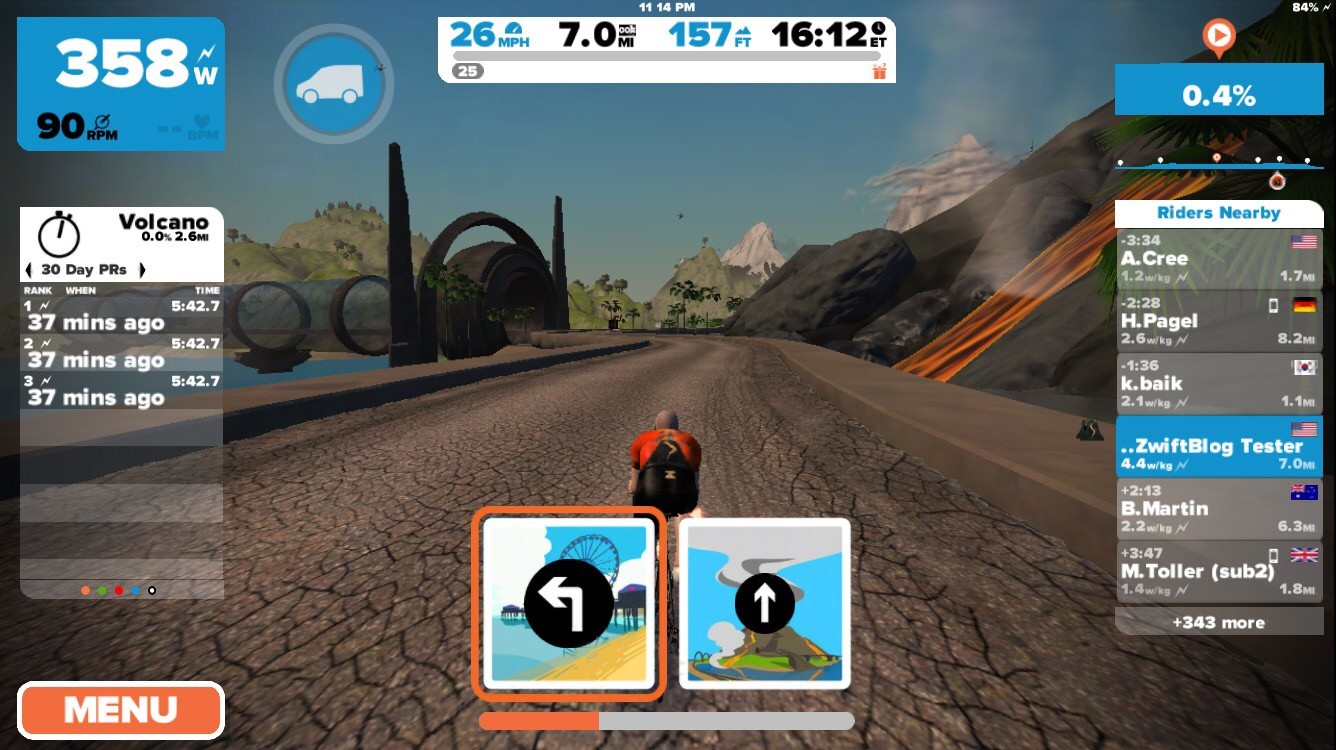 - Volcano Flat: similar to current Flat Route except you hang a left at the Italian Village and ride around the northern leg of the volcano circuit clockwise then back out through the ocean tunnel and onto the main road and the start/finish banner. Route Details >